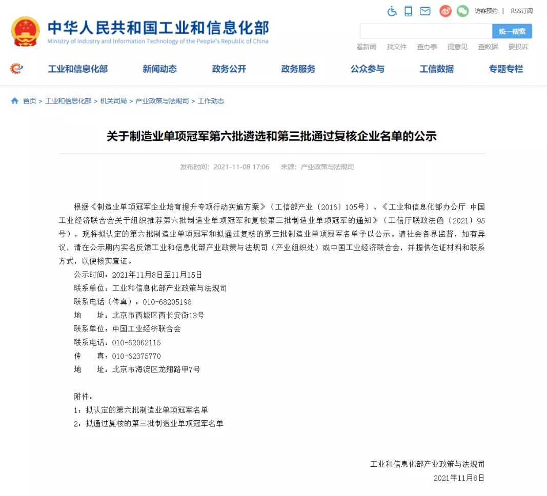 众所周知,国家制造业单项冠军入选要求高,评选程序严格,需长期专注于特定细分产品市场,生产技术或工艺国际领先,单项产品市场占有率位居全球前列的企业,也是国家在此领域的最高称号。
